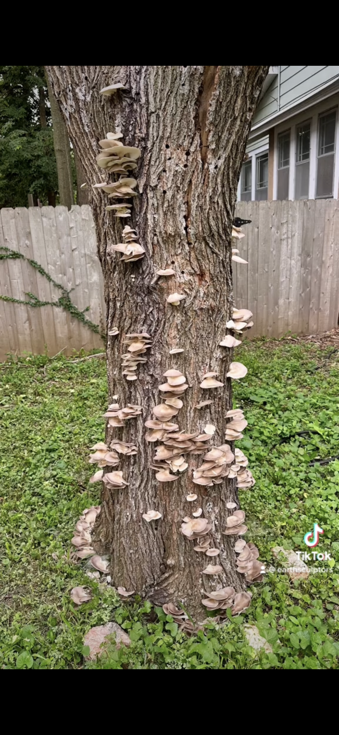 This is a mulberry tree we cut down to the trunk, and inoculated with Oyster Mushroom spawn. A few years later it has now become a tremendously productive source of delicious and nutritious food.